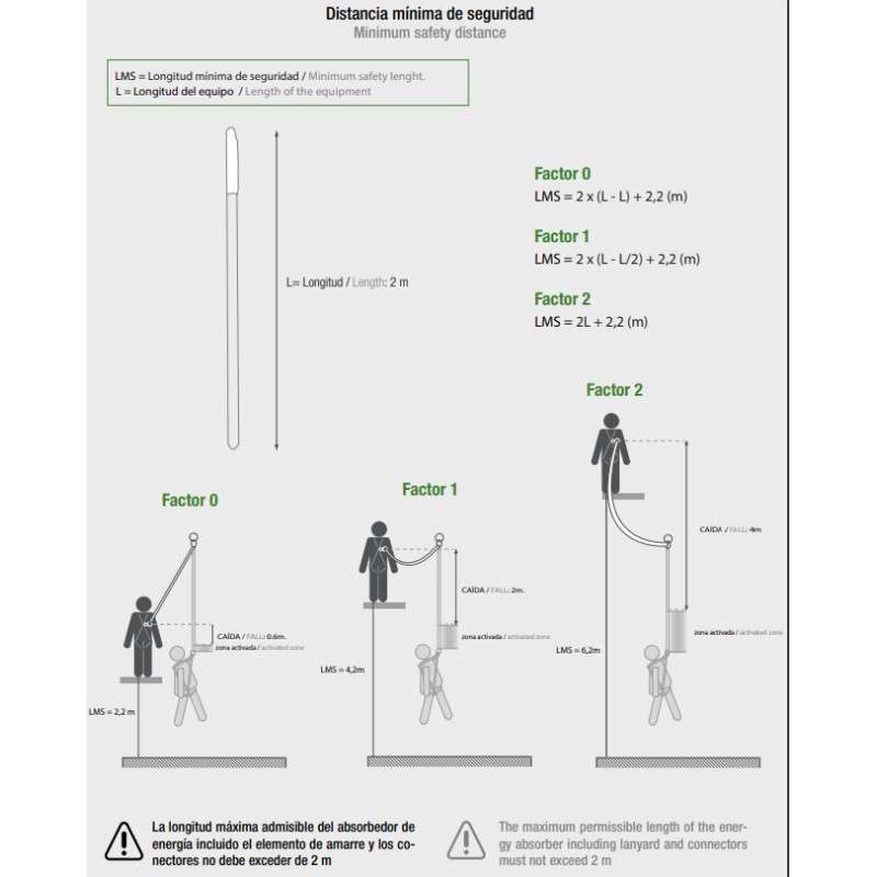 El absorbedor de energía modelo 32-A es un componente esencial para la conformación de un sistema anticaídas seguro, diseñado para soportar condiciones de trabajo exigentes. Está concebido para conectarse a un arnés anticaídas mediante un conector y un elemento de amarre adecuado.