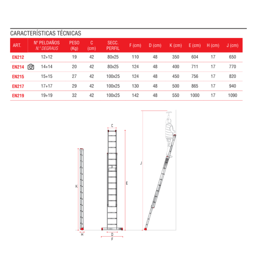 El modelo EN200 está fabricado en aluminio, con dos tramos que corren entre sí mediante un sistema de poleas accionado mediante cuerda, base estabilizadora con tacos de alta adherencia, par de ruedas superiores para asegurar apoyo y agarre a la pared y peldaños de 3 cm.