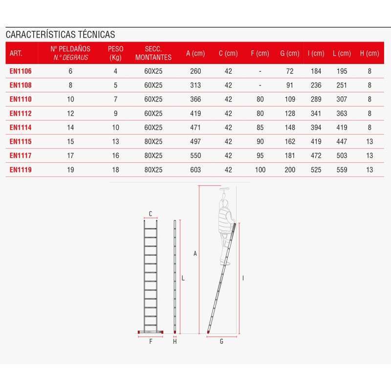 La EN1100 es una escalera de aluminio para uso en apoyo.
