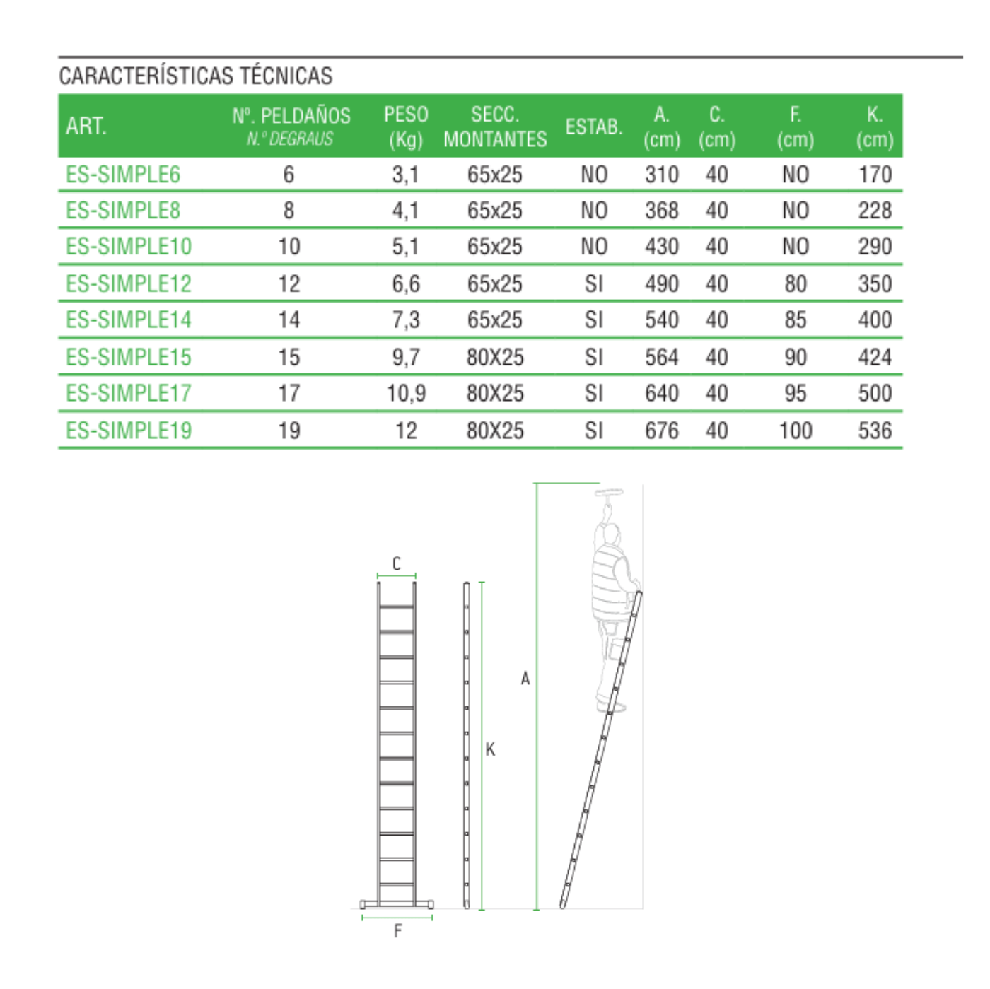 La ES-SIMPLE es una escalera de aluminio para uso en apoyo. Tiene los peldaños antideslizantes con 3 cm de profundidad y la base estabilizadora con 2 tacos de goma que le confiere mayor seguridad y asegura el cumplimiento de las actuales normativas europea EN 131.