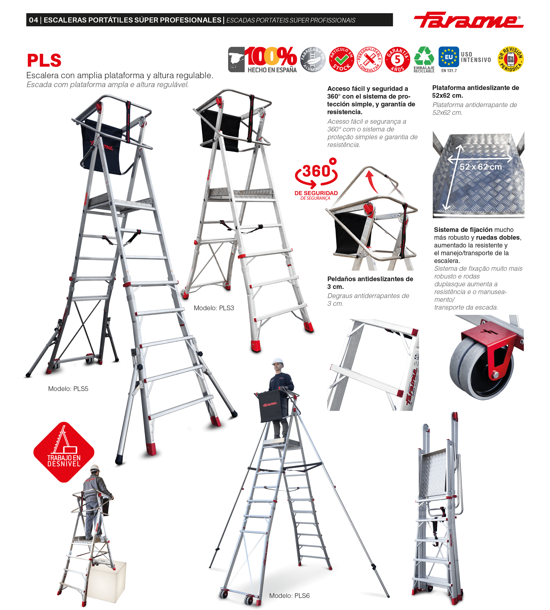 La PLS es ideal para obras de construcción y es la opción preferida por los profesionales que buscan una escalera ligera, segura y fácil de manejar. Además cuenta con dos estabilizadores retráctiles que aumentan la seguridad durante su uso. También se utiliza ampliamente en la industria para tareas de mantenimiento.