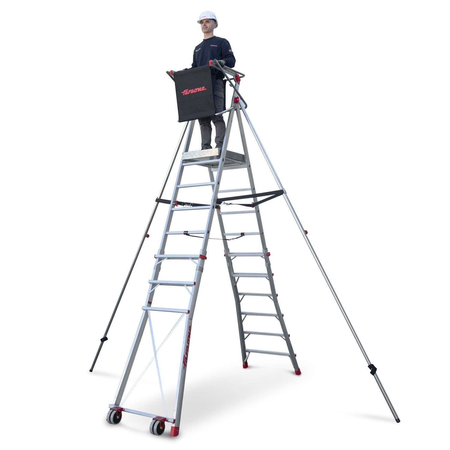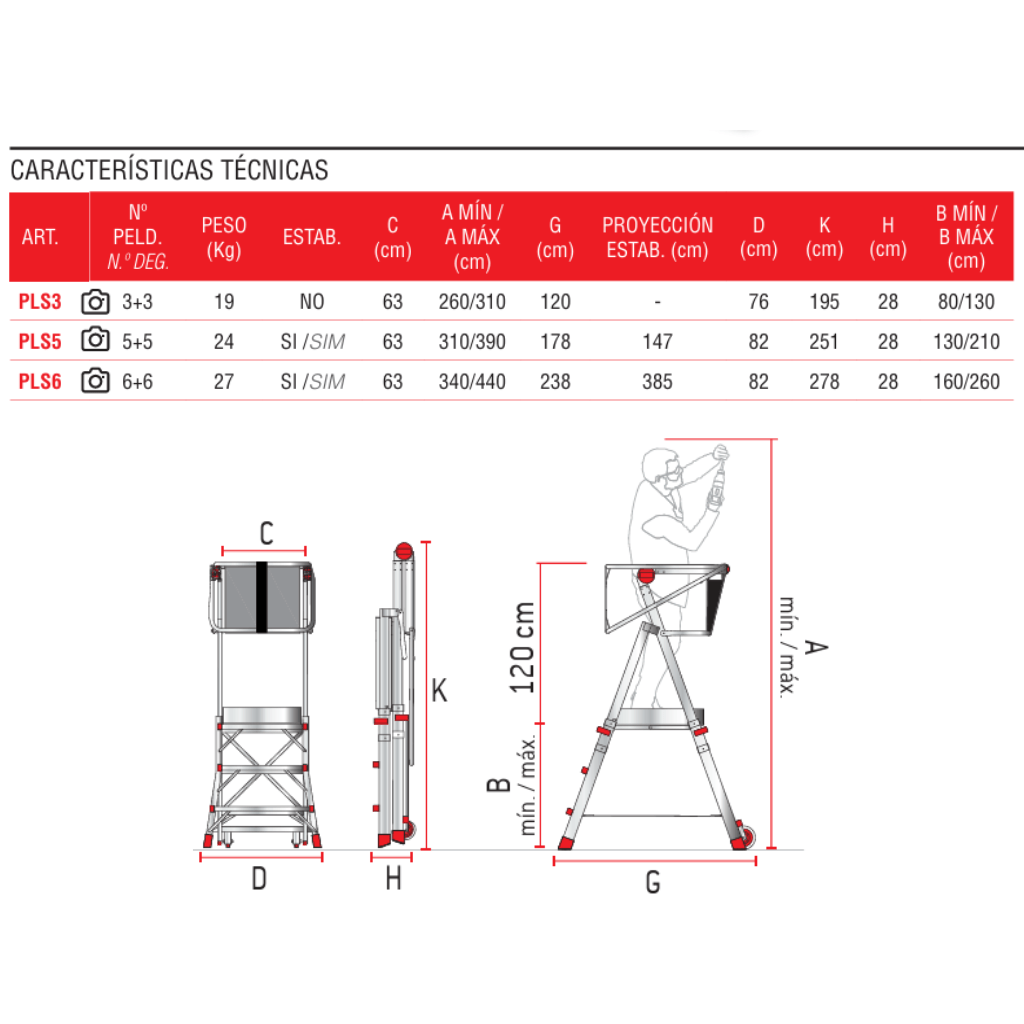 La PLS es una escalera plegable y regulable en altura, equipada con ruedas dobles y una amplia plataforma de trabajo antideslizante de 52×62 cm. El acceso a la plataforma se realiza mediante una escalera con peldaños antideslizantes de 3 cm de profundidad, lo que garantiza un ascenso seguro.