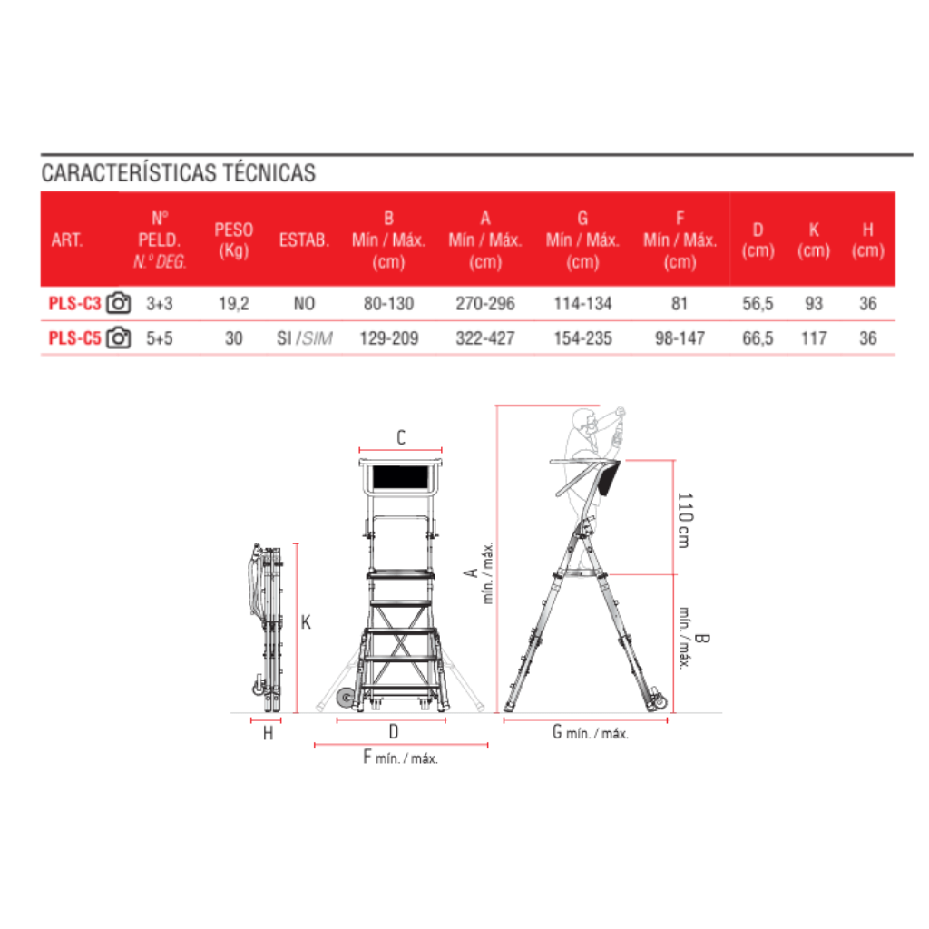 La escalera PLS-COMPACT es una solución profesional diseñada para entornos de trabajo que exigen estabilidad, seguridad y versatilidad. Cuenta con una amplia plataforma antideslizante de 40 x 50 cm con altura ajustable, ideal para trabajos prolongados en altura.