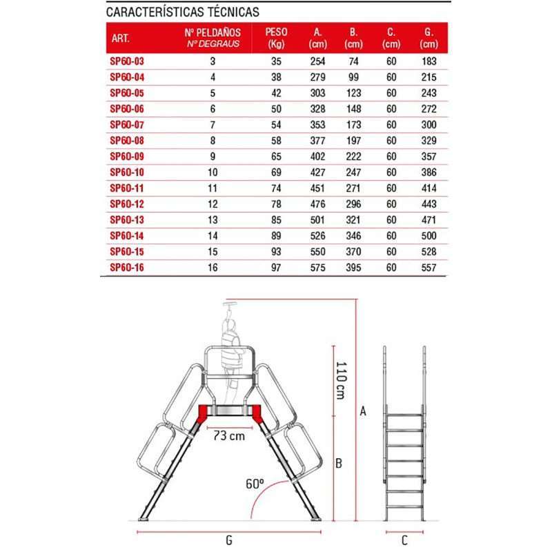 Cumple con la normativa europea EN 14122-3, garantizando la máxima fiabilidad y viene acompañada de certificado de conformidad y manual de instrucciones. Con una impresionante capacidad de carga de hasta 150 kg, la SP60 se posiciona como la herramienta indispensable para cualquier entorno industrial.