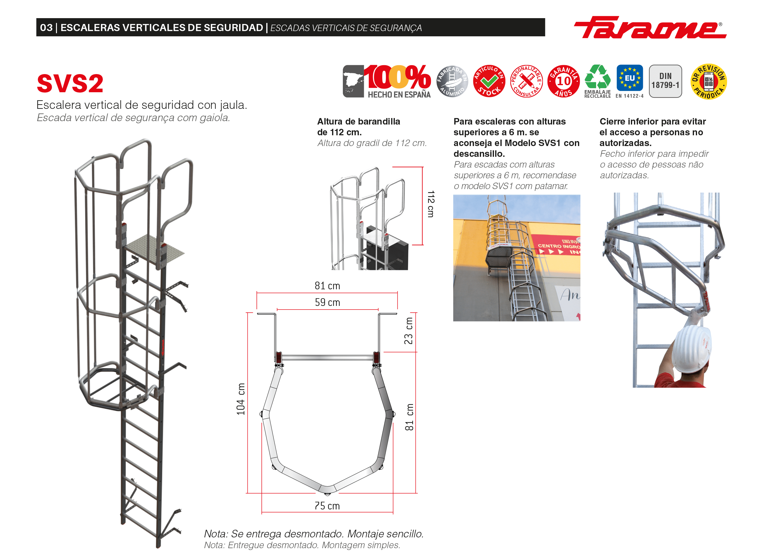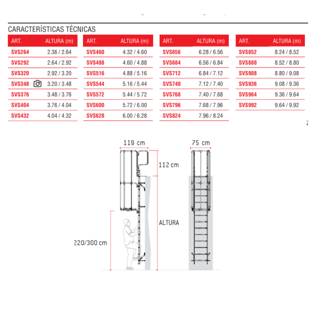 La escalera modelo SVS2 se fabrica a medida según la altura de la pared proporcionada por el cliente. Opcionalmente, se puede pedir con la jaula de seguridad pintada en cualquier color y con el primer tramo de la escalera desmontable.